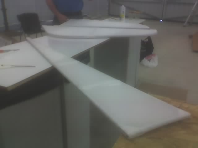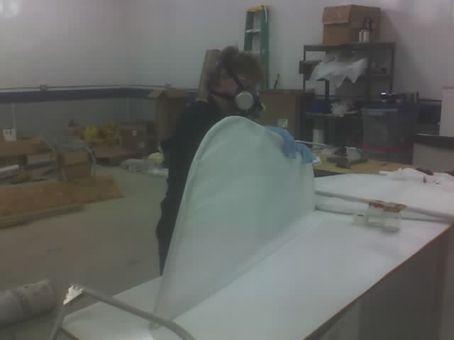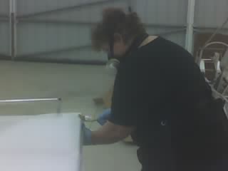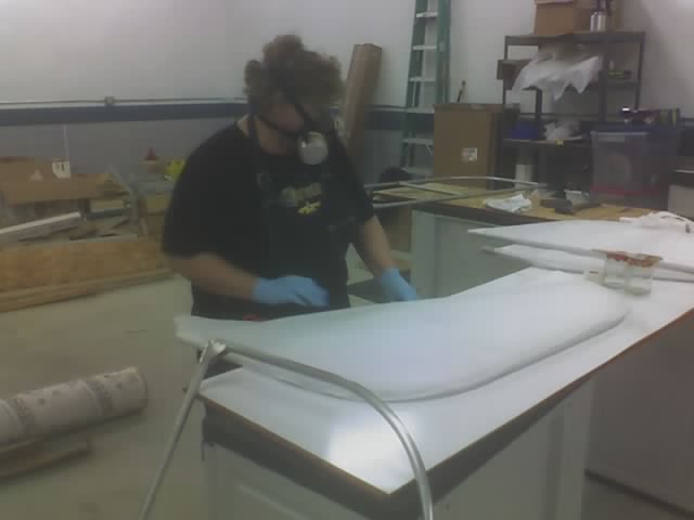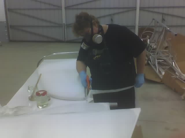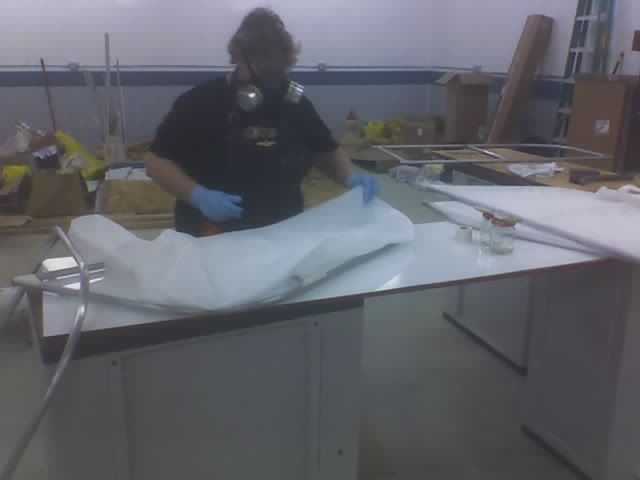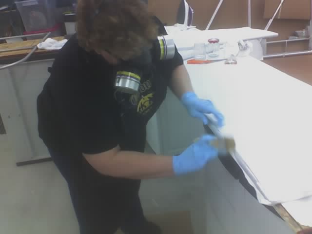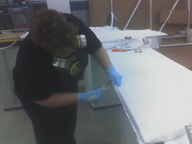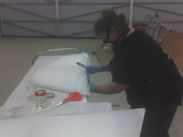 The second side goes on over the first in the same manner. Cover the fabric on the part with polytak while being careful not to unglue it from the part. Then us a brush saturated with MEK to draw the polytak through. |