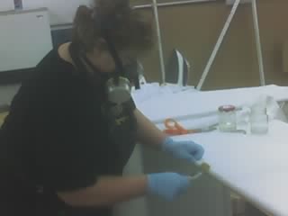 While wearing double nitrile gloves (in case the outer glove rips, which happens often) and a mask to prevent inhaling MEK fumes, coat the tubes of the piece to be covered with polytak where it will adhere to the fabric and lay fabric out on the piece to cover. |